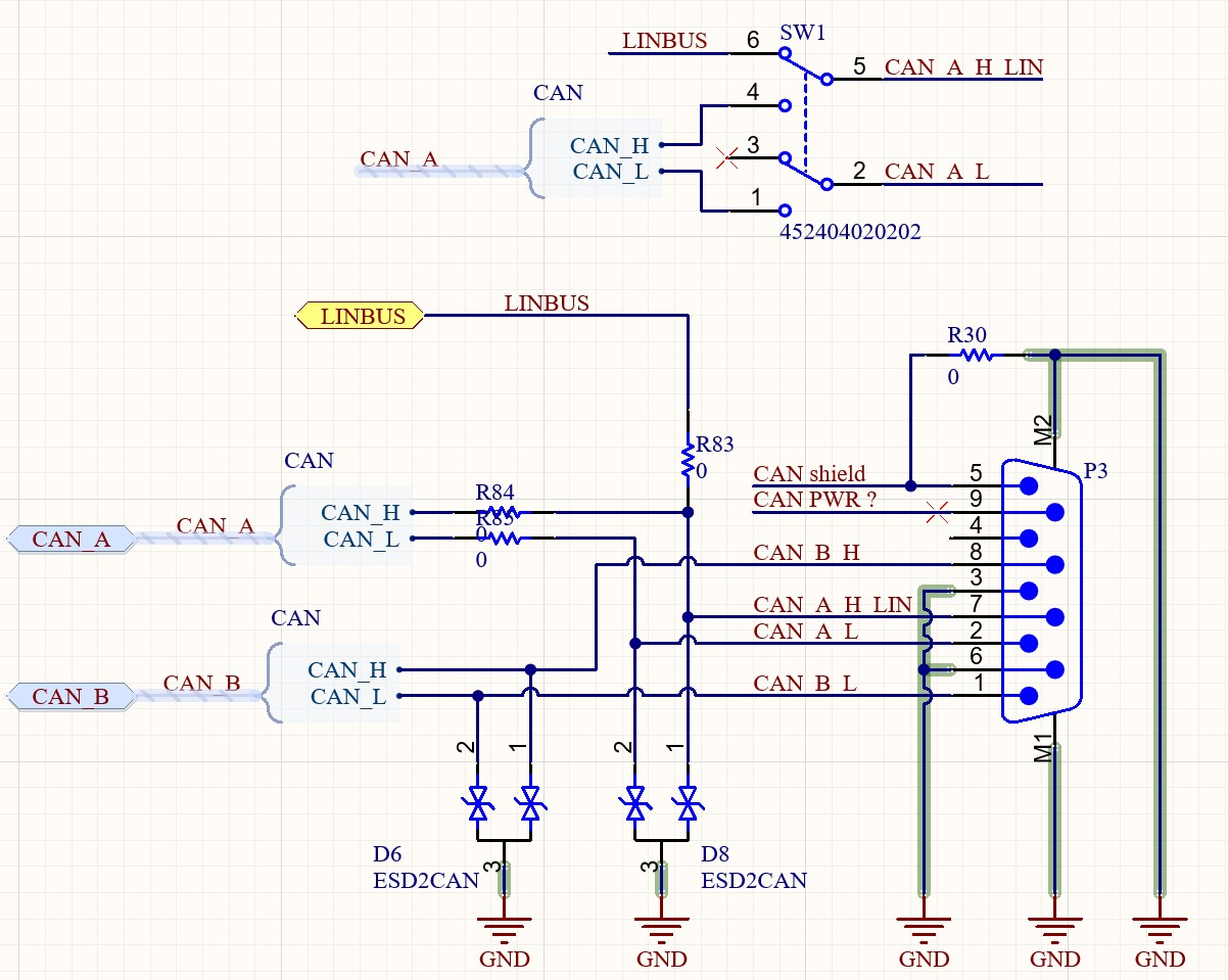 CAN A is directly connected to the spring contact terminal and can be connected to the DB-9 connector with the help of SW1. lToggling SW1 will disconnect LIN from Pin7 and connect CANA to pin 7 and 2