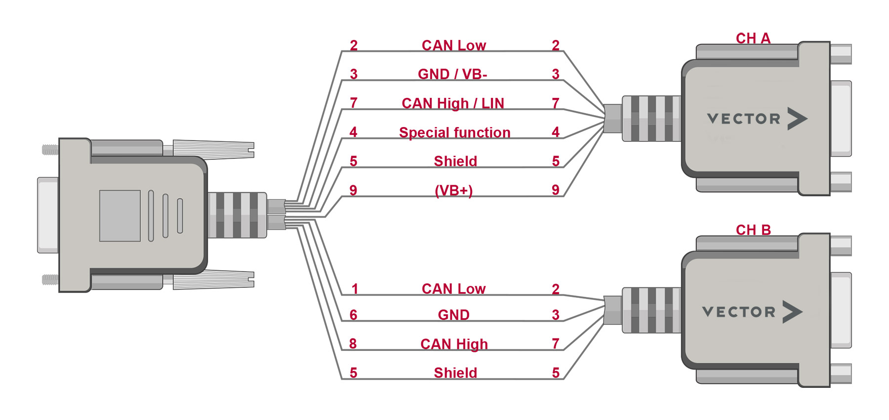 CAN B is permanently connected to the CAN B channel of the DB-9 connector in accordance with the Vector pinout.