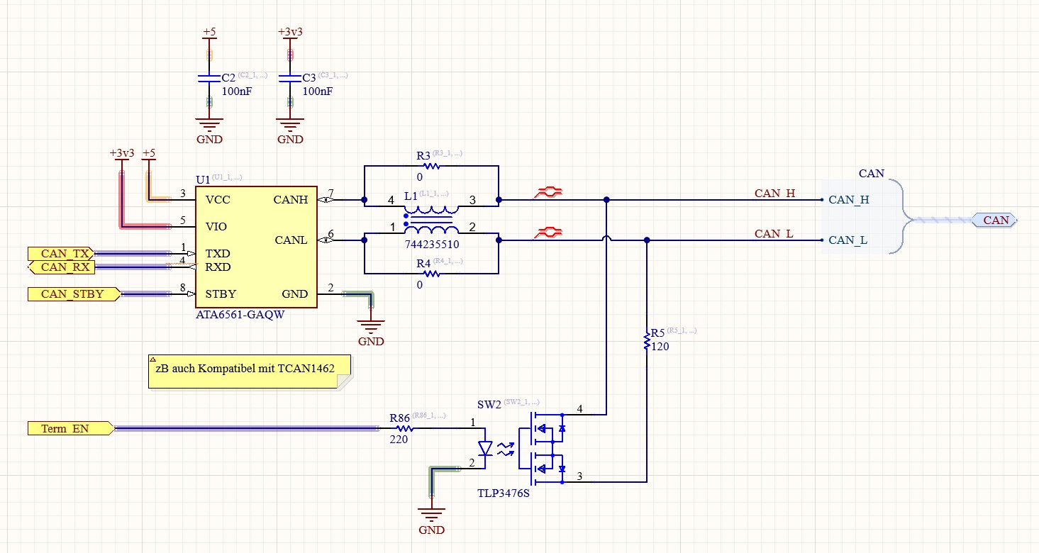 The ARDEP Mainboard comes with two CAN-FD capable CAN Transceivers. each of which, is connected to a common mode choke, ESD protection as well as a hardware configurable 120-Ohm termination.