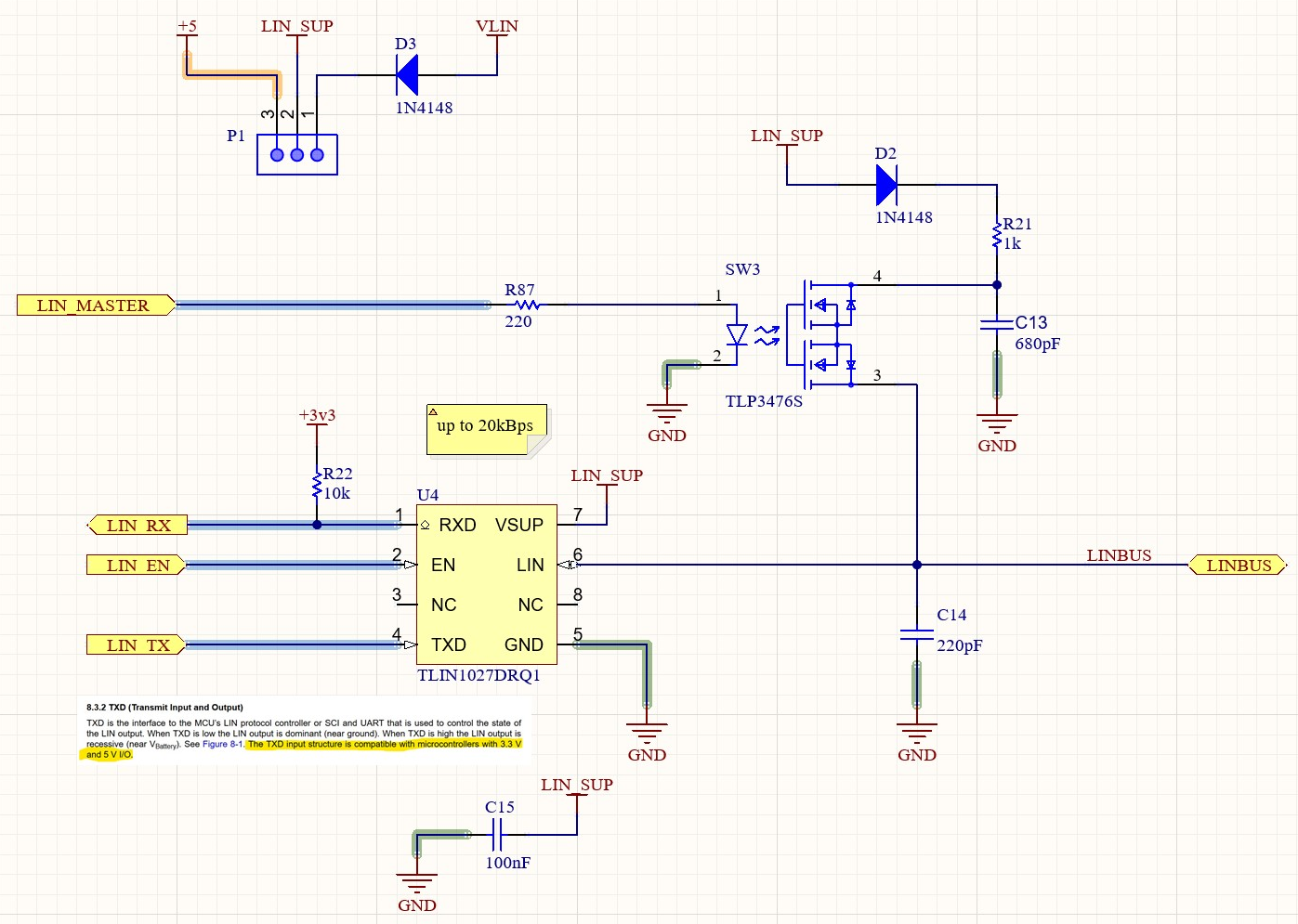 The User can select to Supply the LIN driver from the mainboard internal 5 V supply, or an external Supply connected to the spring contact terminal. The LIN supply is specified for up to 24 V and is additionally connected to one of the 0.1” Header connectors.