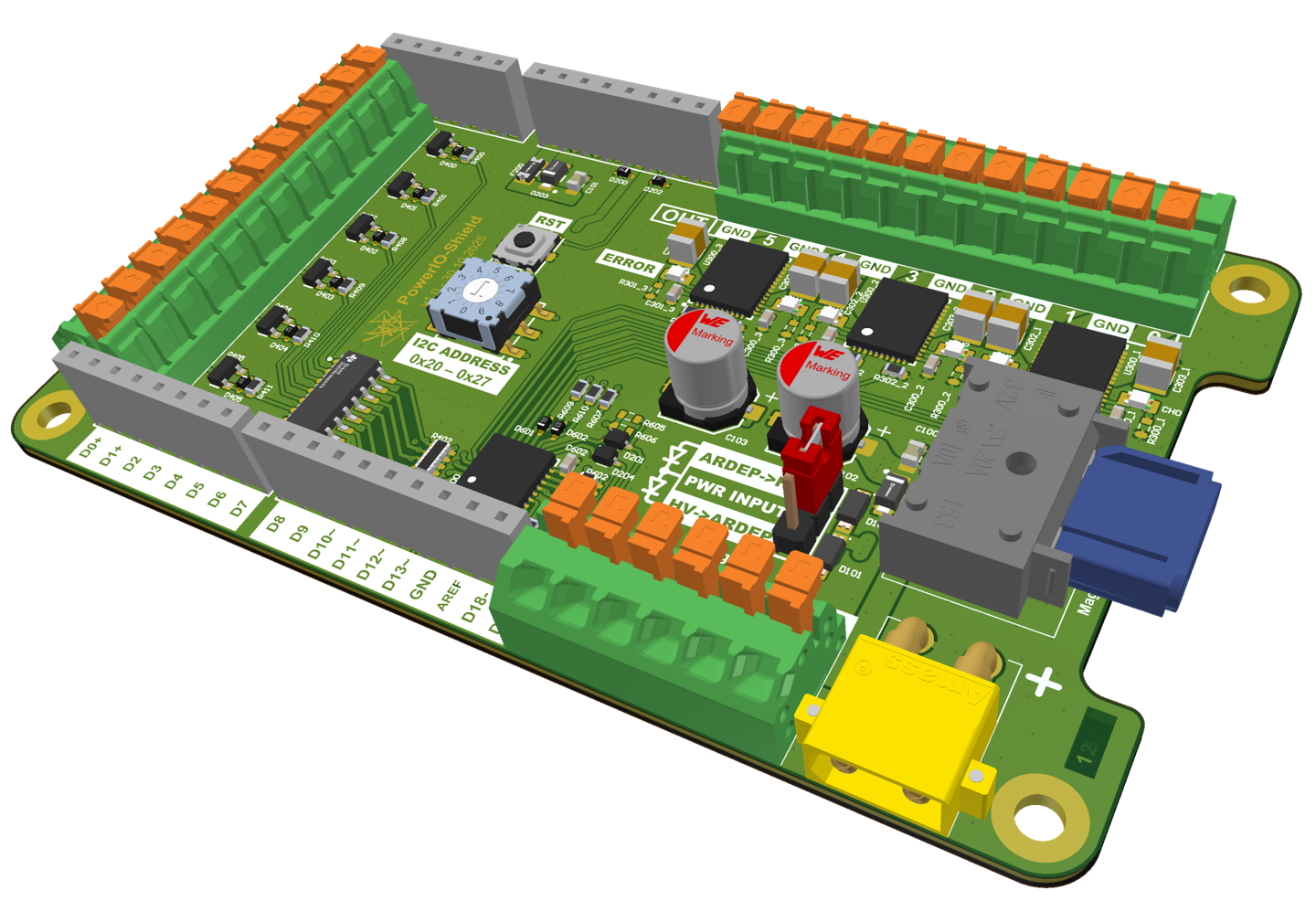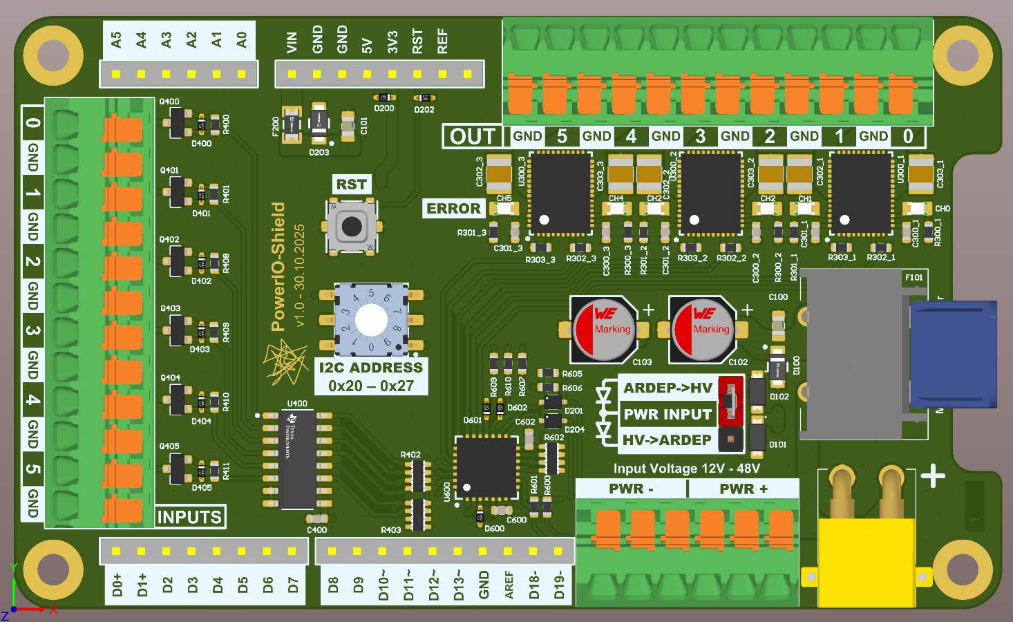 The shield offers six 48V-capable inputs and 6 high-side output drivers capable of driving 3A+ each and a total current of 10A for supply voltages of up to 48V.