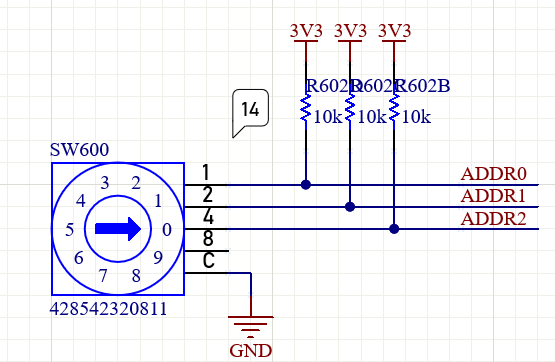 To allow more than one Power IO shield to be stacked, the shields do not directly interface with the ARDEP’s GPIOs but instead use an MCP23017T \(I^2C\) port expander with individually configurable address. The shield’s \(I^2C\) address can be configured to one of the 8 available addresses using a rotary selector that is directly connected to the MCP23017T address lines.
