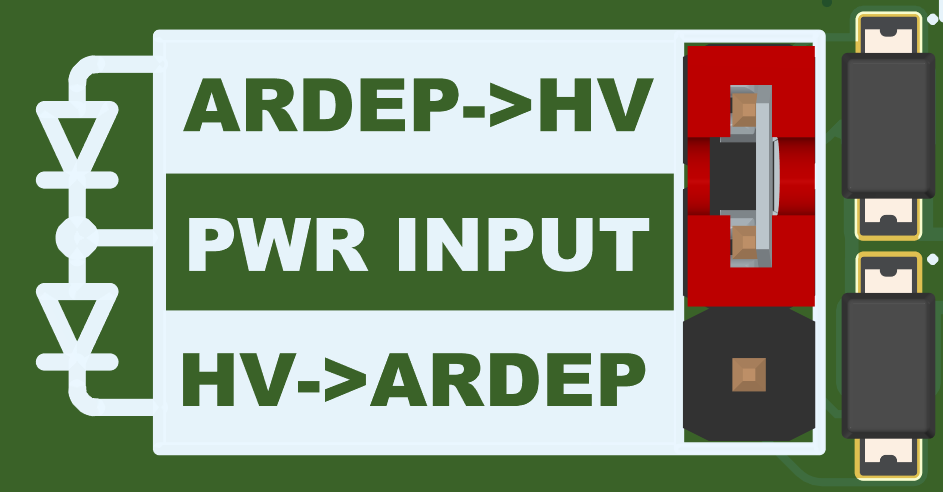 With the selection jumper in the top position, the HV outputs are powered via the ARDEP mainboard and a Schottky diode. This setting can be used if the ARDEP mainboard is connected to a high-voltage supply and the power IO outputs do not need to supply a lot of current (E.g. for testing or toggling high voltage signals)